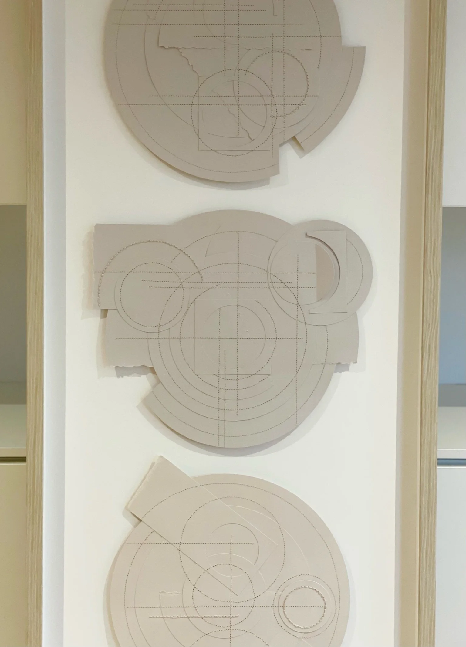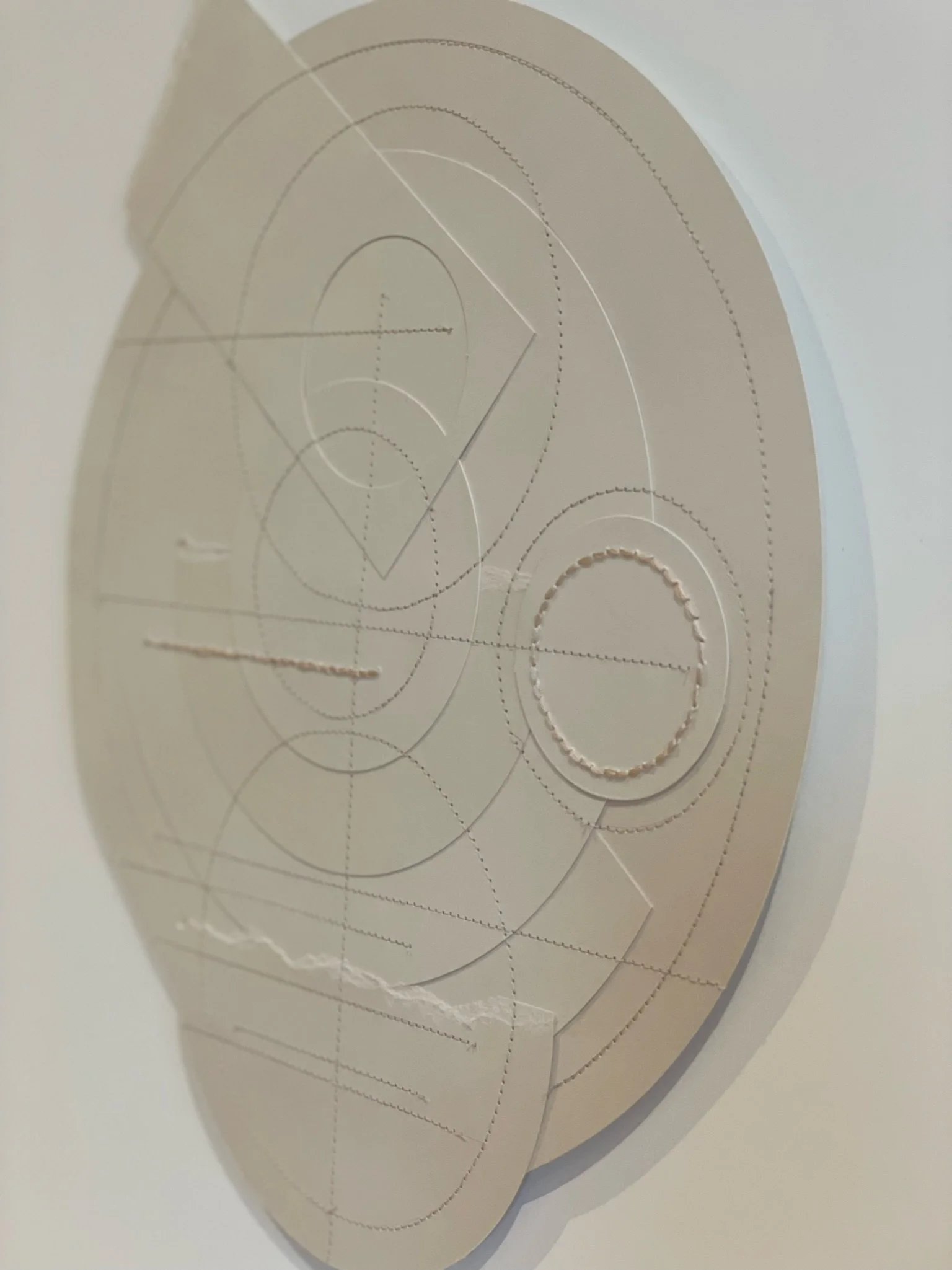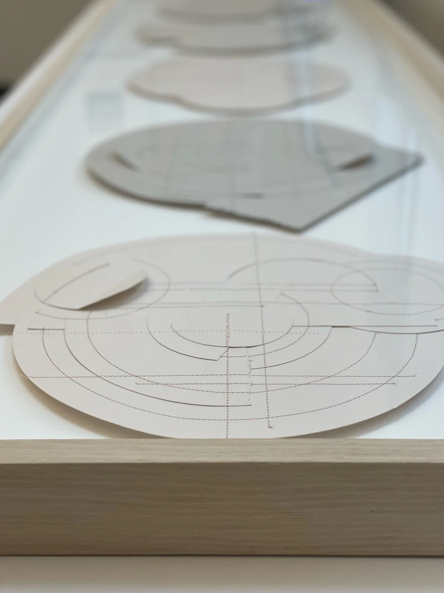 tonal series: berkley commisionpaper collage + machine stitching70”W x 20”H white washed oak floating frame